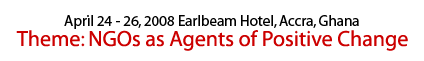 "Accra 2008 WANGO Conference" is the first edition of a WANGO regional conference/retreat to be held in Africa. It is a follow up to the 2007 World Congress of NGOs held in Toronto, Canada in November. The forum is to serve as the leading voluntary and membership meeting for over 300 representatives/members of NGOs, government, business and support agencies in the region and beyond. It will address issues of fundamental import crucial to the growth and development of the humanitarian sector in sub-Saharan Africa.